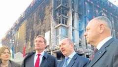 Spuren der Zerstörung: Der Dolmetscher Oleg Blaschtschuk (2.v.r.) erklärt Leipzigs Oberbürgermeister Burkhard Jung die aktuelle Entwicklung am Maidan in Kiew. Fotos (2): Björn Meine